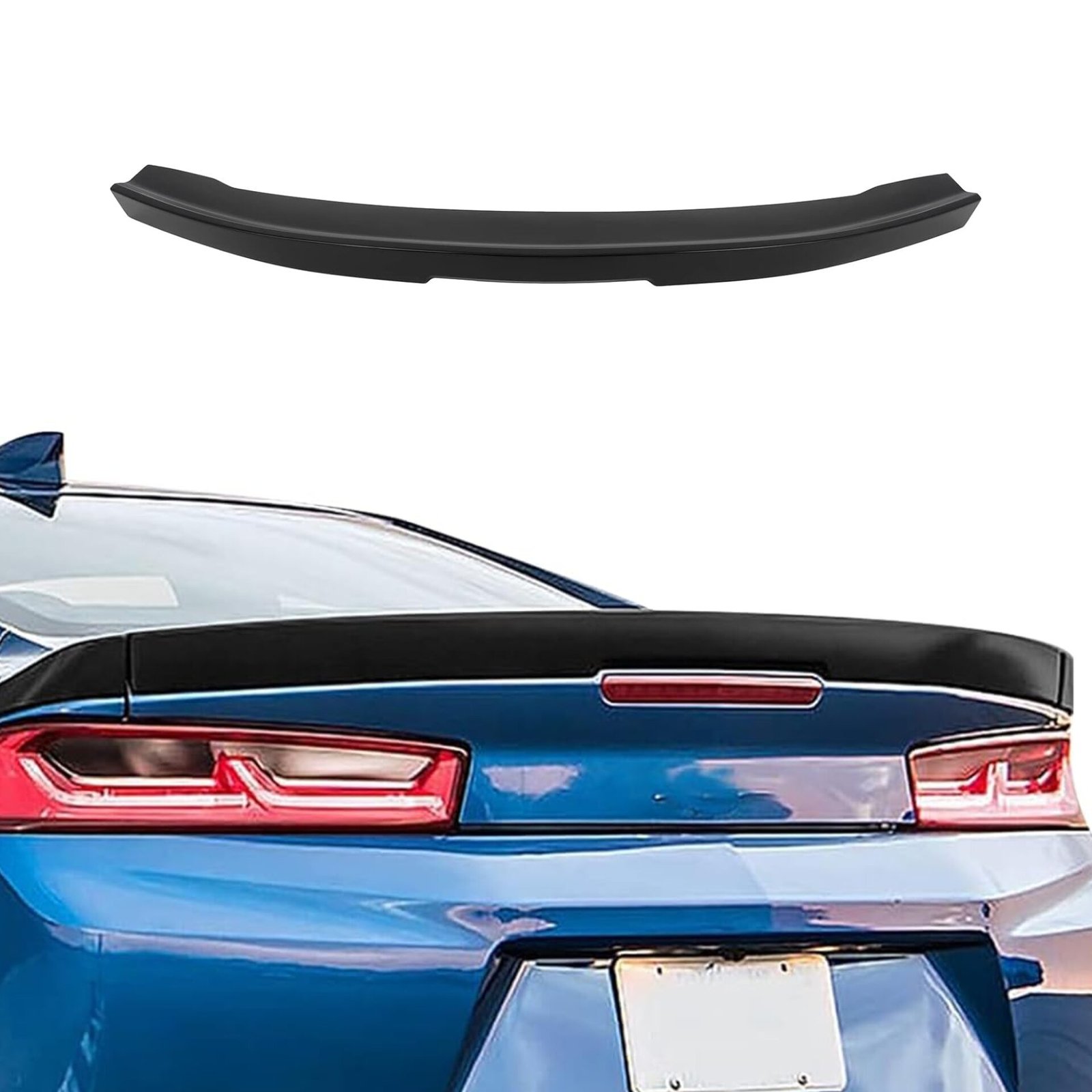 Alerón trasero para Camaro 2016+ en negro matte, resistente y aerodinámico. Mejora la estabilidad a altas velocidades y realza el diseño deportivo del vehículo.