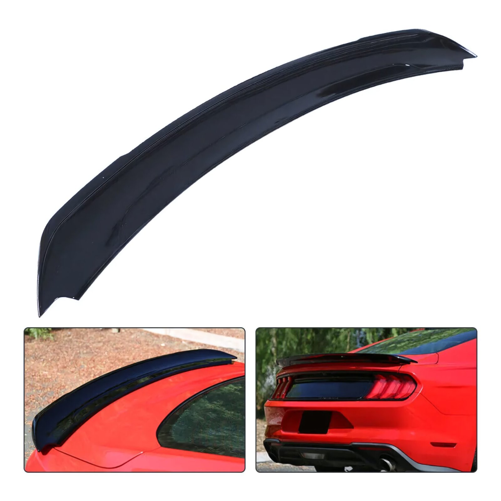 Alerón trasero para Mustang 2015-2023 en negro gloss. Materiales de alta resistencia y perfil aerodinámico que aumentan estabilidad y diseño deportivo.