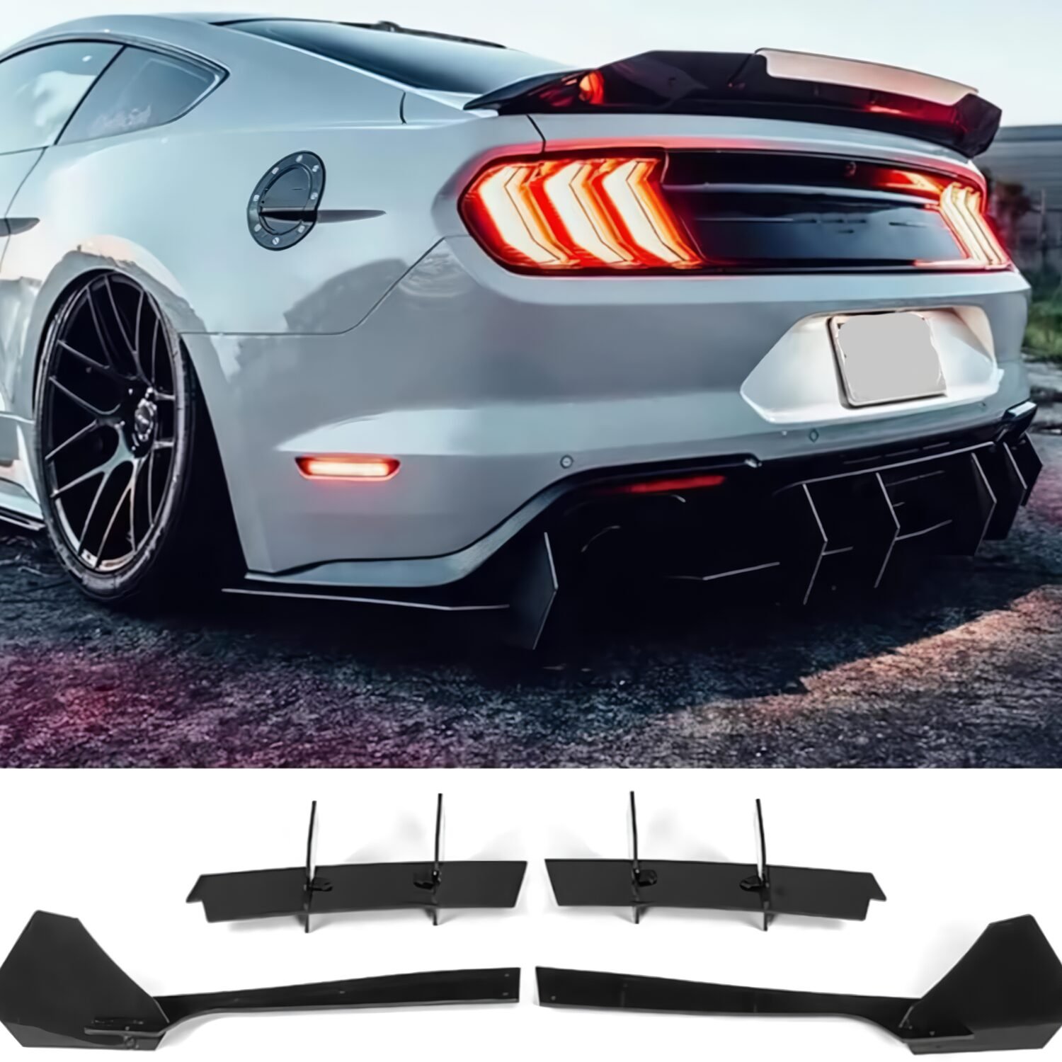 Extensión adicional para el difusor trasero de Ford Mustang 2018+, diseñada para reforzar la estética deportiva y dar un look más bajo y marcado. Fabricada en material de calidad, se integra de forma precisa con el difusor existente.